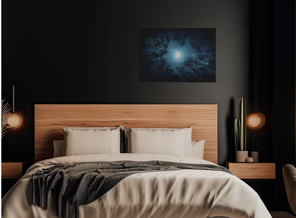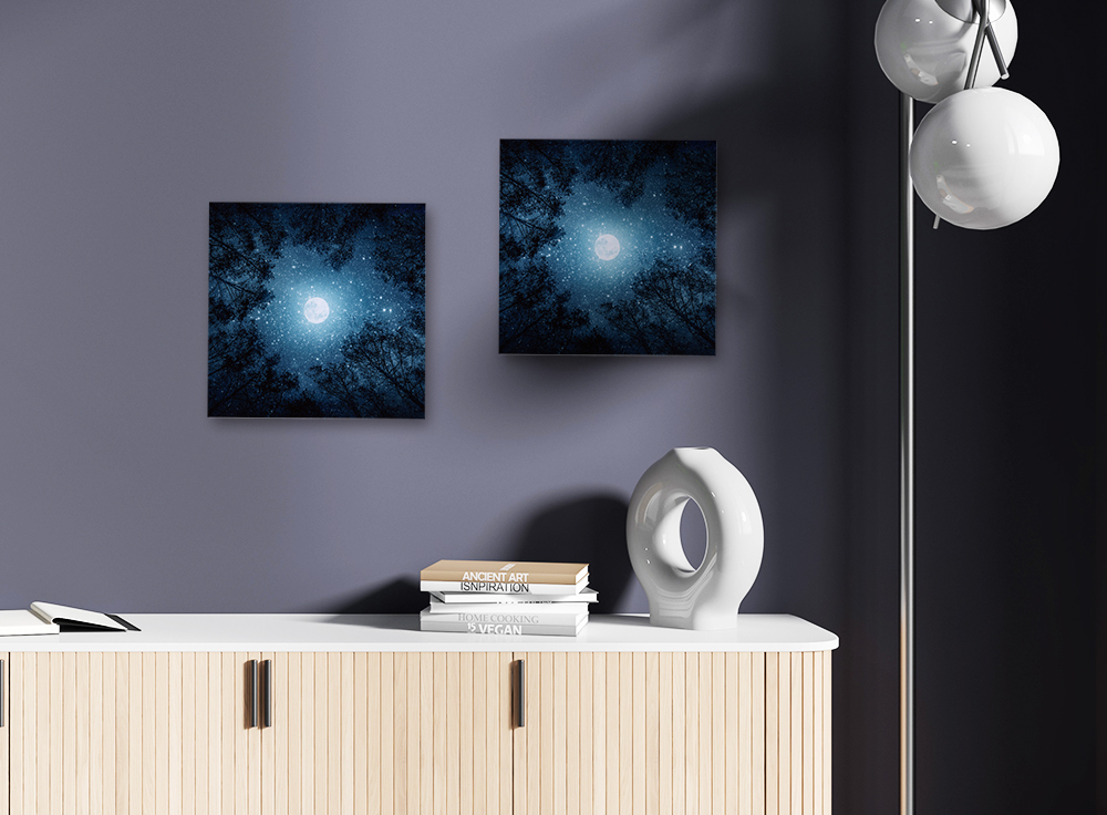 青く澄んだ夜空を背景に、満月の白銀の輝きが一際目を惹きます。シックで幻想的なインテリアにぴったりのクロスボード。