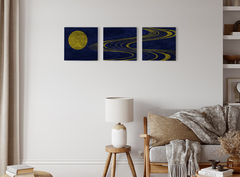 夜の静かな川と輝く月の美しさを、優雅な曲線で表現したデザインのクロスボードです。静寂と幻想の世界を描いた人気のデザイン。曲線が描く流れるような美しさ、月の神秘的な輝き。日々の喧騒から解放してくれるような癒しをインテリアに。